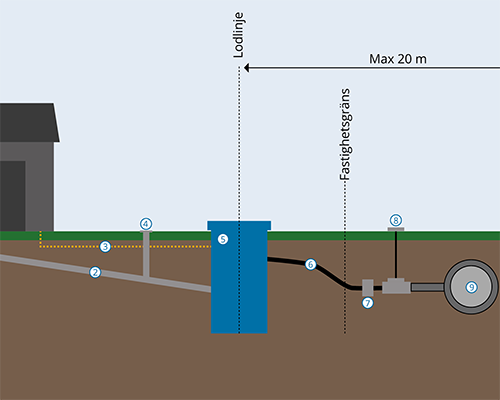 Pumpen är försedd med backventil. Backventilerna förhindrar att avloppsvatten rinner tillbaka till fastigheten eller uppsamlingstanken.